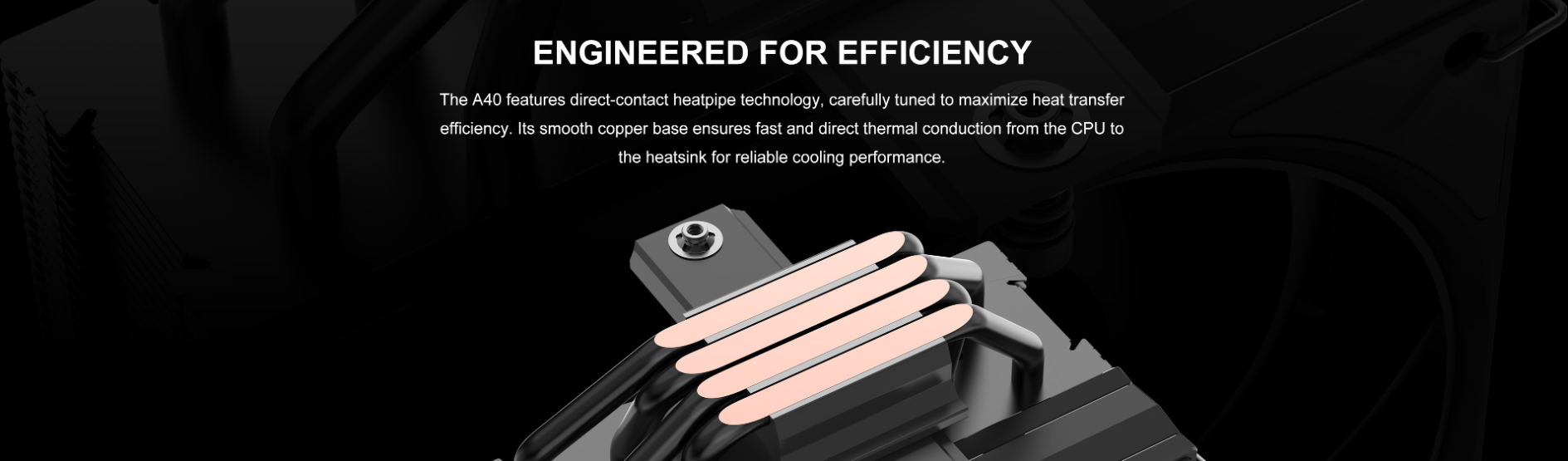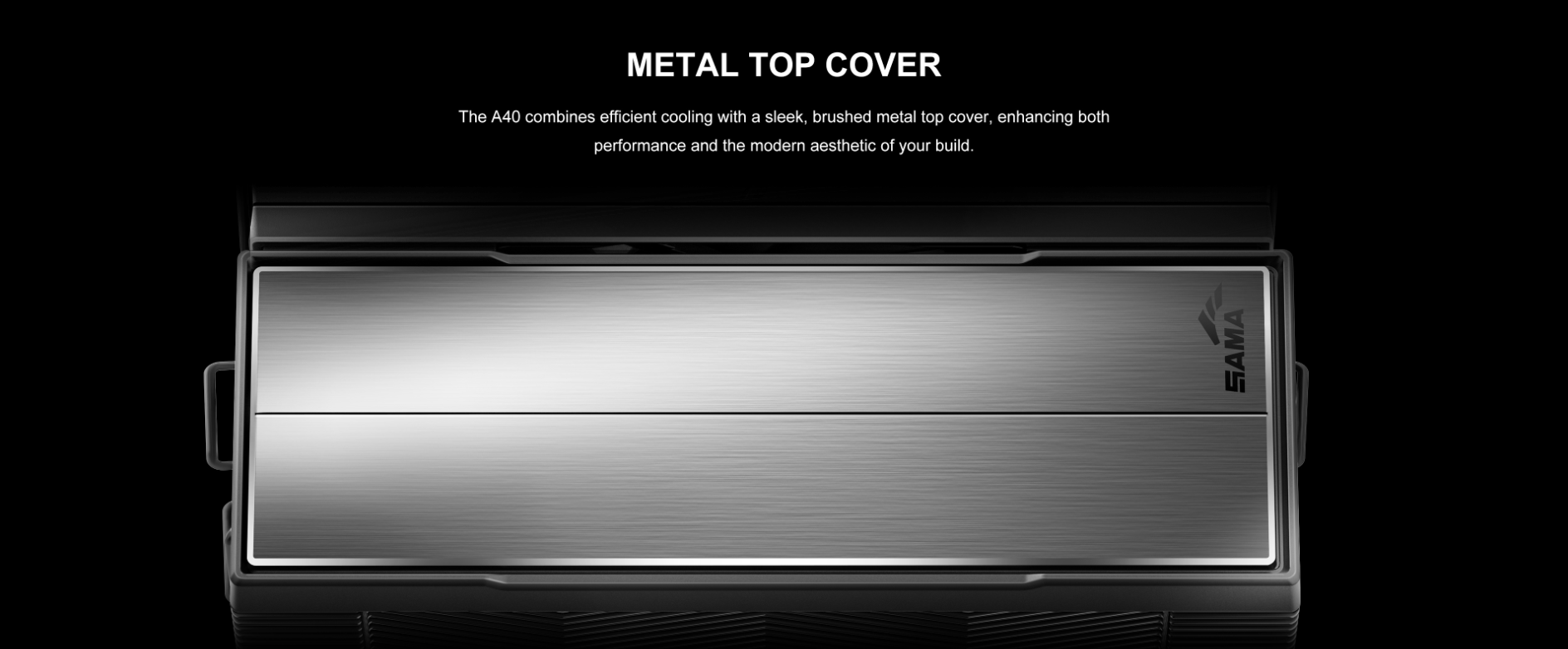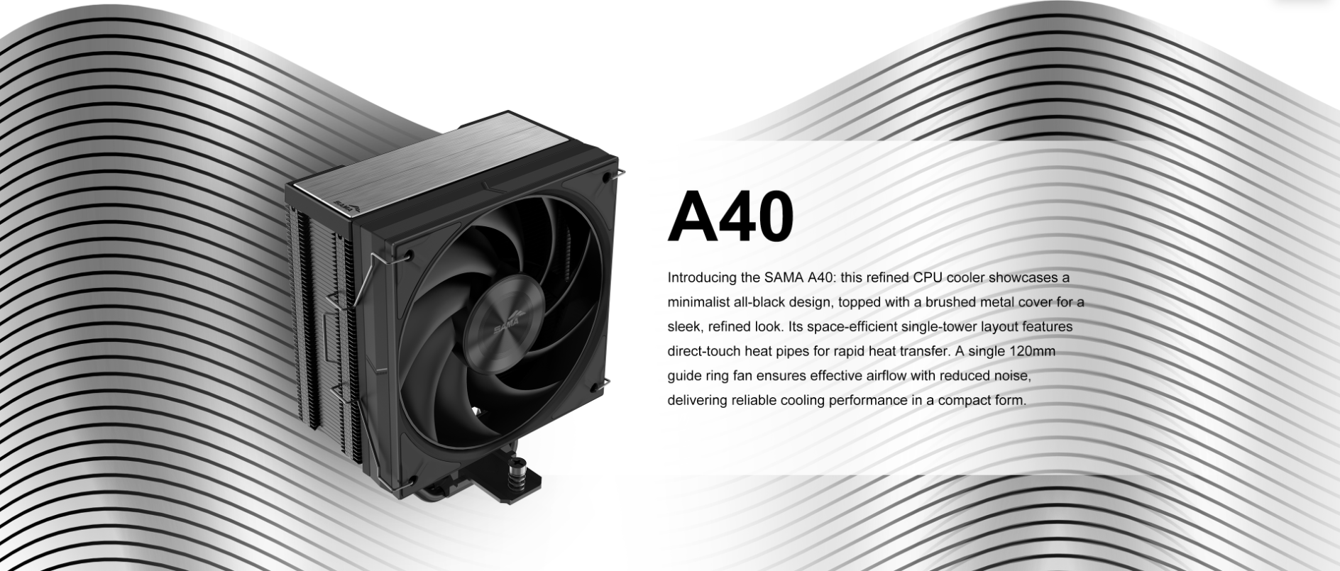 The SAMA A40 delivers powerful cooling in a stylish all-black build with a brushed metal top, direct-touch heatpipes, and a high-performance 120mm guide ring fan. Perfect balance of performance, silence, and style for your gaming or workstation PC.