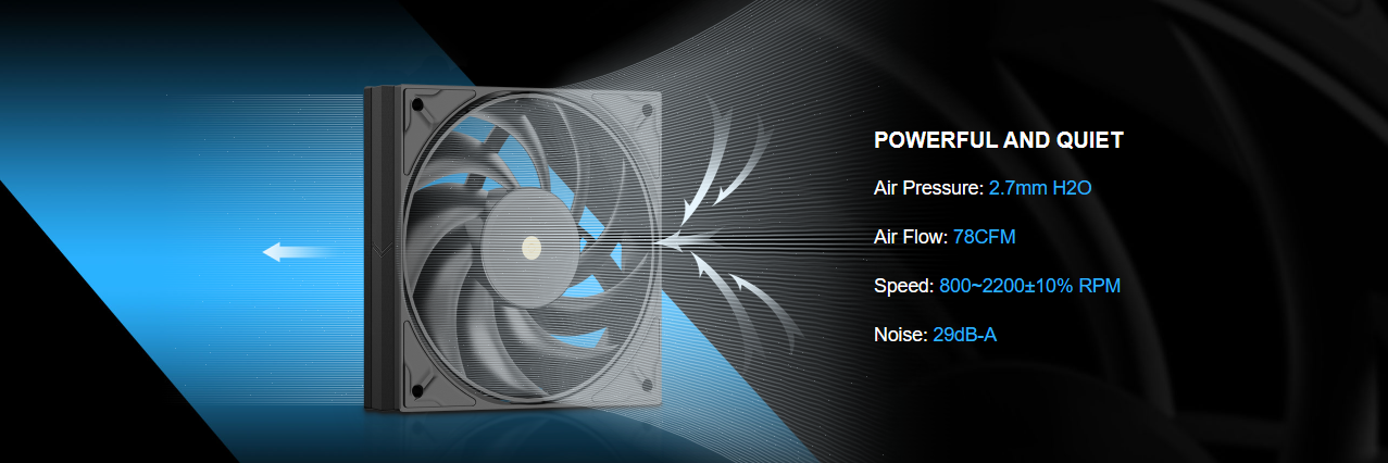 🌀 Dual 120mm Fans – High airflow (78CFM) with low noise (29dB)