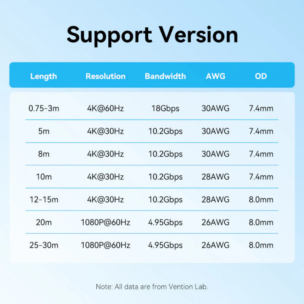 * Resolution: 4K@60Hz (0.75~3 m)/4K@30Hz (5~15 m)/1080p@60Hz (20 m)
