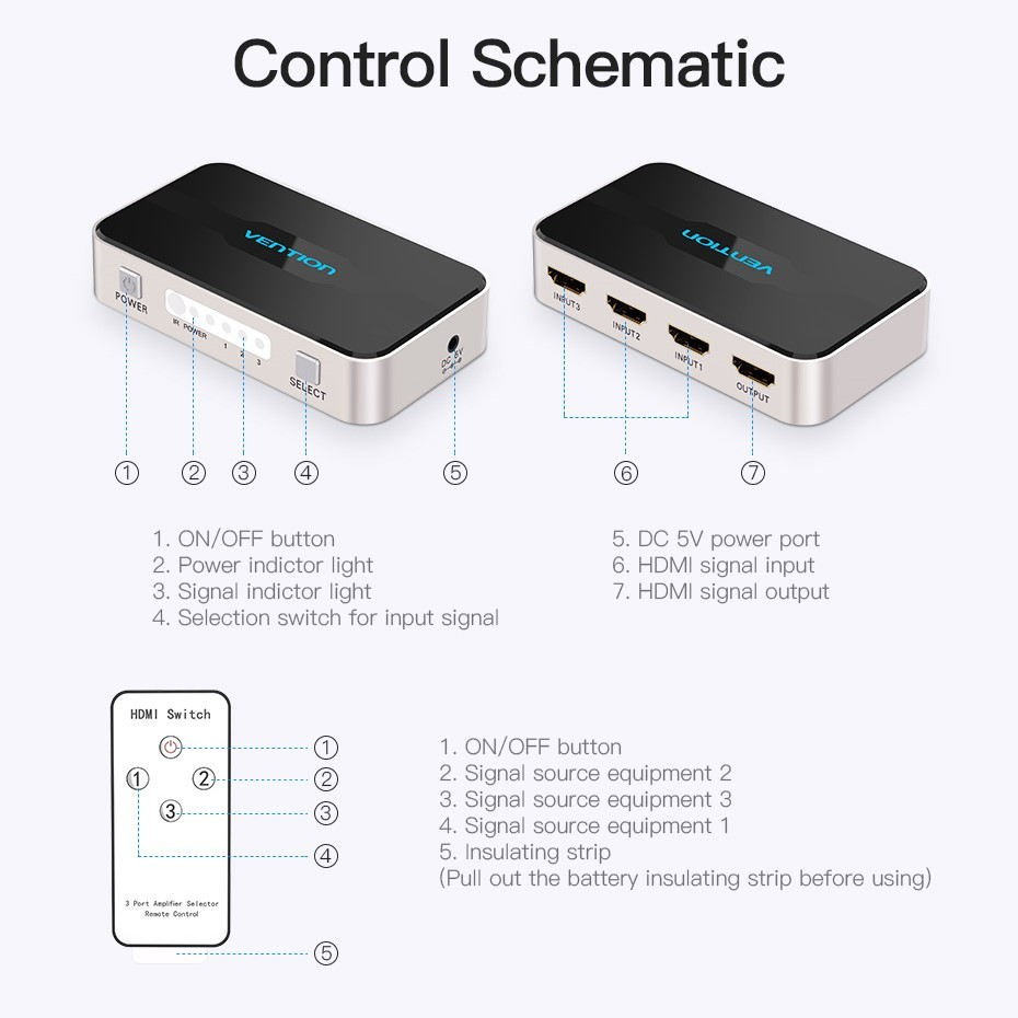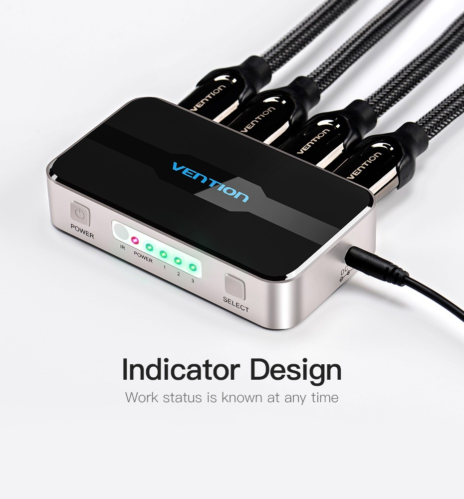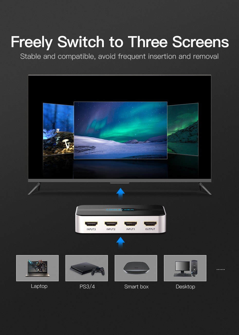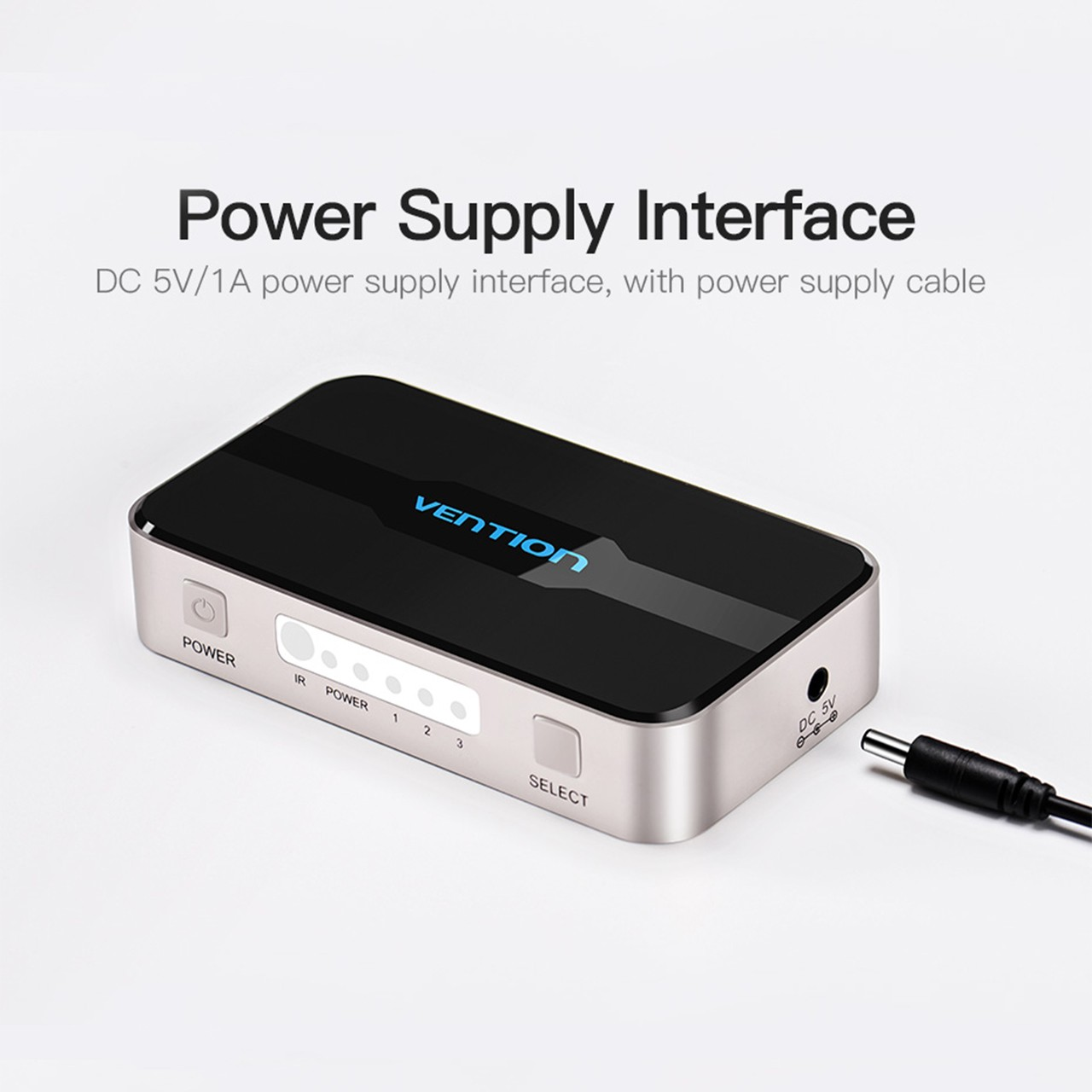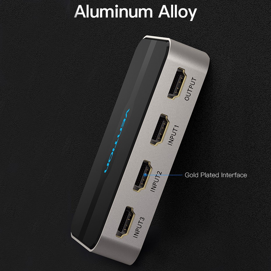 Simplify your entertainment setup with the Vention 3-in-1 Out HDMI Switch (AFFG0)! Effortlessly connect and switch between three HDMI devices on one display — perfect for TVs, monitors, consoles, and more. Built with a durable aluminum alloy shell, it delivers sleek design, stable transmission, and long-lasting performance.