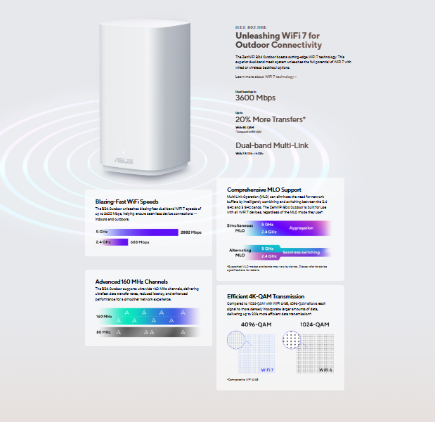 Experience blazing BE3600 performance with up to 3600 Mbps combined speed (688 Mbps @2.4GHz + 2882 Mbps @5GHz) using MLO & 4K-QAM. Stream, game, and work without limits.