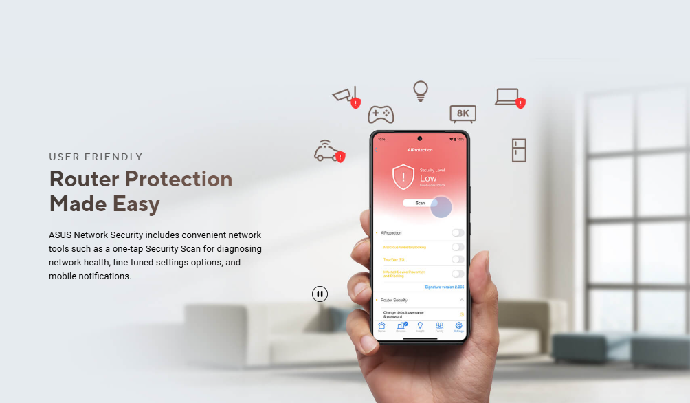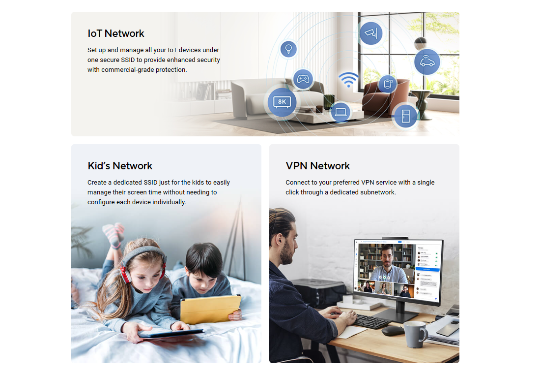 Stay safe with AiProtection Pro, VPN support, and up to 3 separate SSIDs for IoT & guests. Enjoy parental controls with safe browsing and internet scheduling.