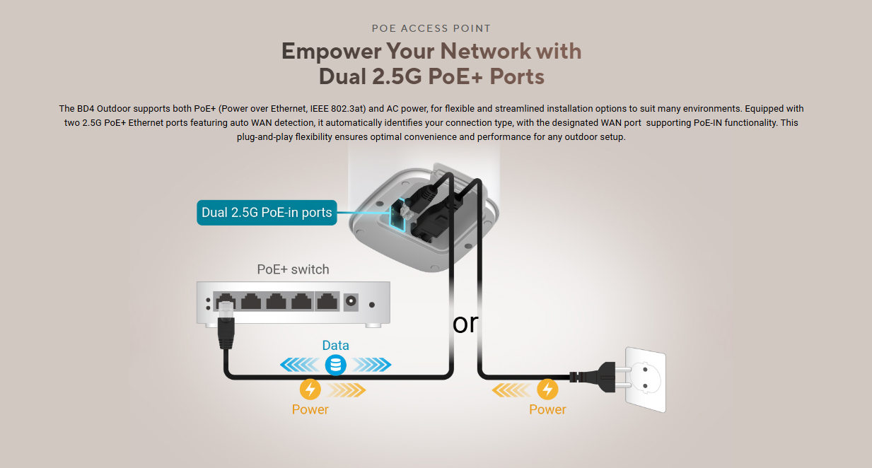 Dual 2.5G PoE-in ports with auto WAN detection, plus AC power option for flexible installation. Includes wall & pole mount kits for easy setup anywhere.