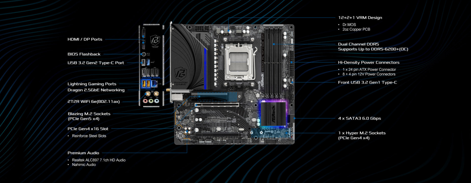Itw | ASRock Motherboard B650M PG Riptide WiFi mATX - DDR5 | AM5 | PCIe Gen5 | WiFi 6E | 2.5G LAN