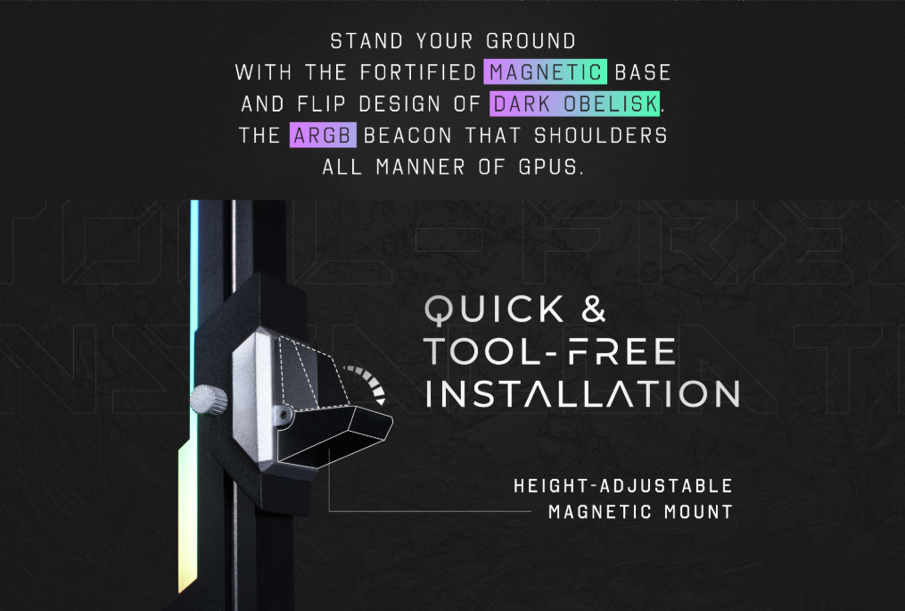 Show off your setup while keeping your graphics card secure with the GALAX Dark Obelisk ARGB GPU Support Stick! Built with a magnetic base and flip design, this premium support stand ensures your high-end GPU—especially RTX 40 series cards—stays perfectly aligned while glowing with stunning ARGB lighting effects.