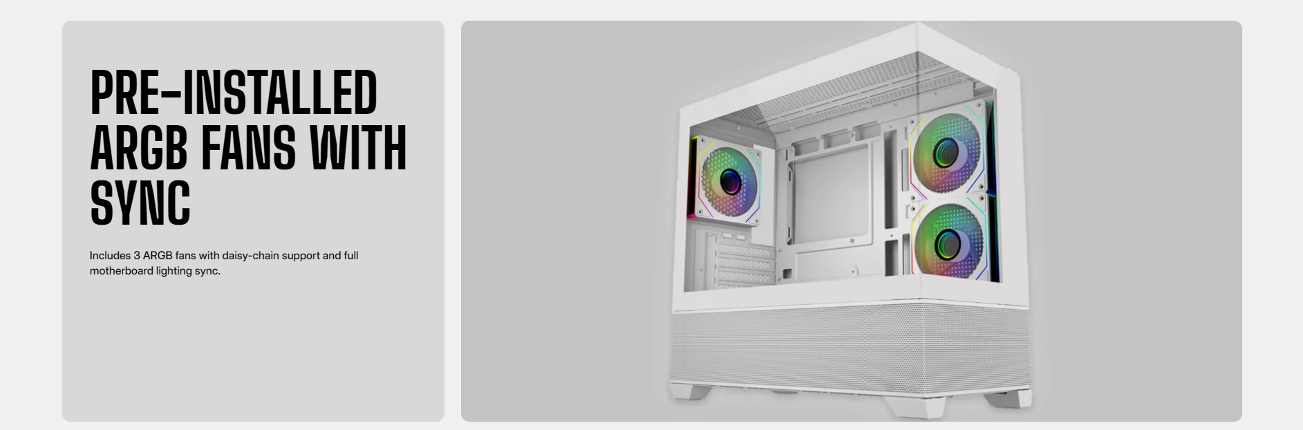 Pre-installed Fans: 3x 120mm ARGB PWM (rear & side)