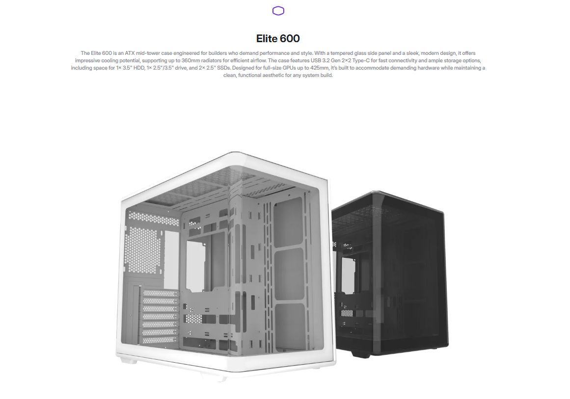 Cooler Master PC Case ELITE 600 ATX Mid Tower Tempered Glass Panoramic Panel 360mm Radiator | itw