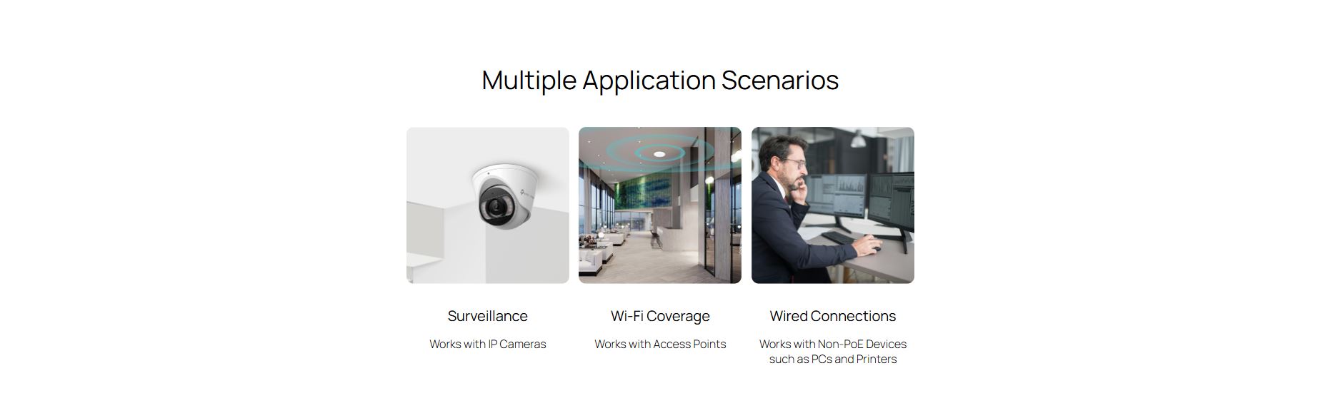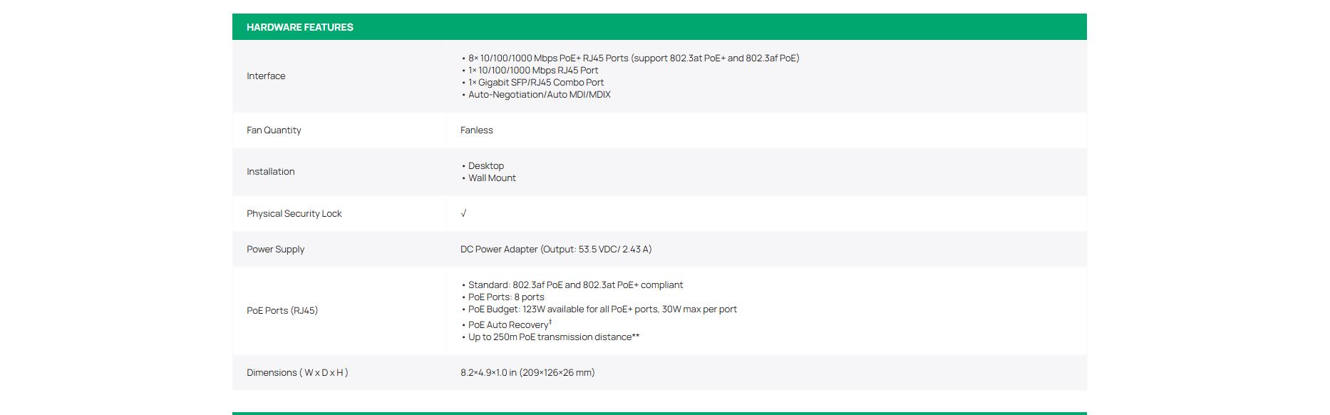 > 8× 10/100/1000Mbps PoE+ RJ45 Ports (support 802.3at PoE+ and 802.3af PoE)