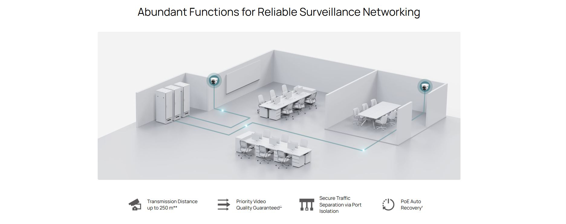 > Up to 250m PoE**, QoS△, PoE Auto Recovery‡, and Port Isolation for reliable surveillance networking