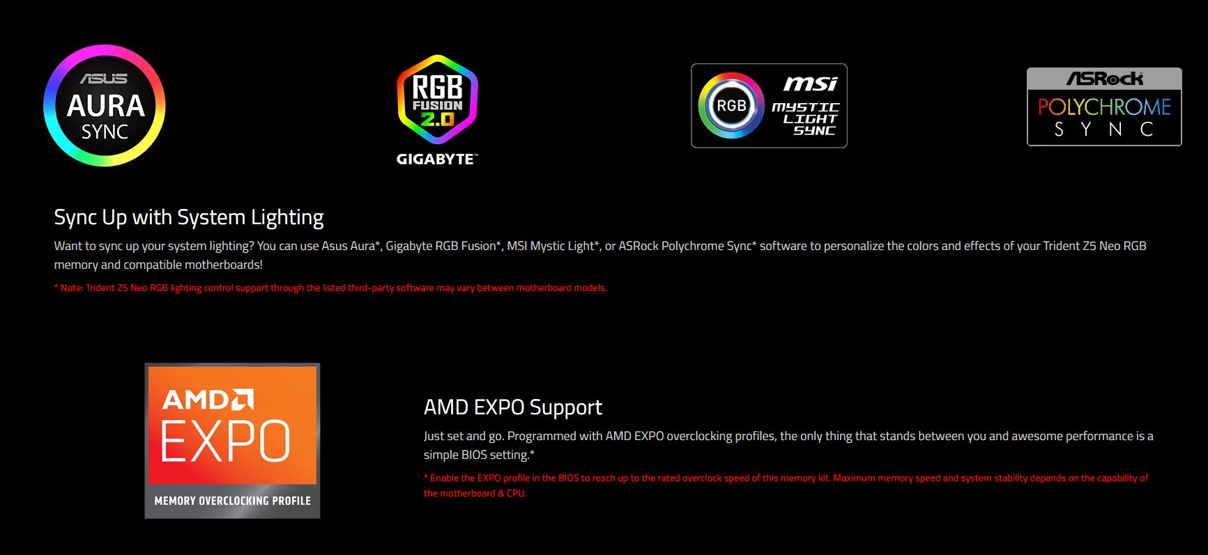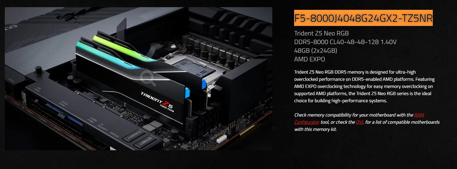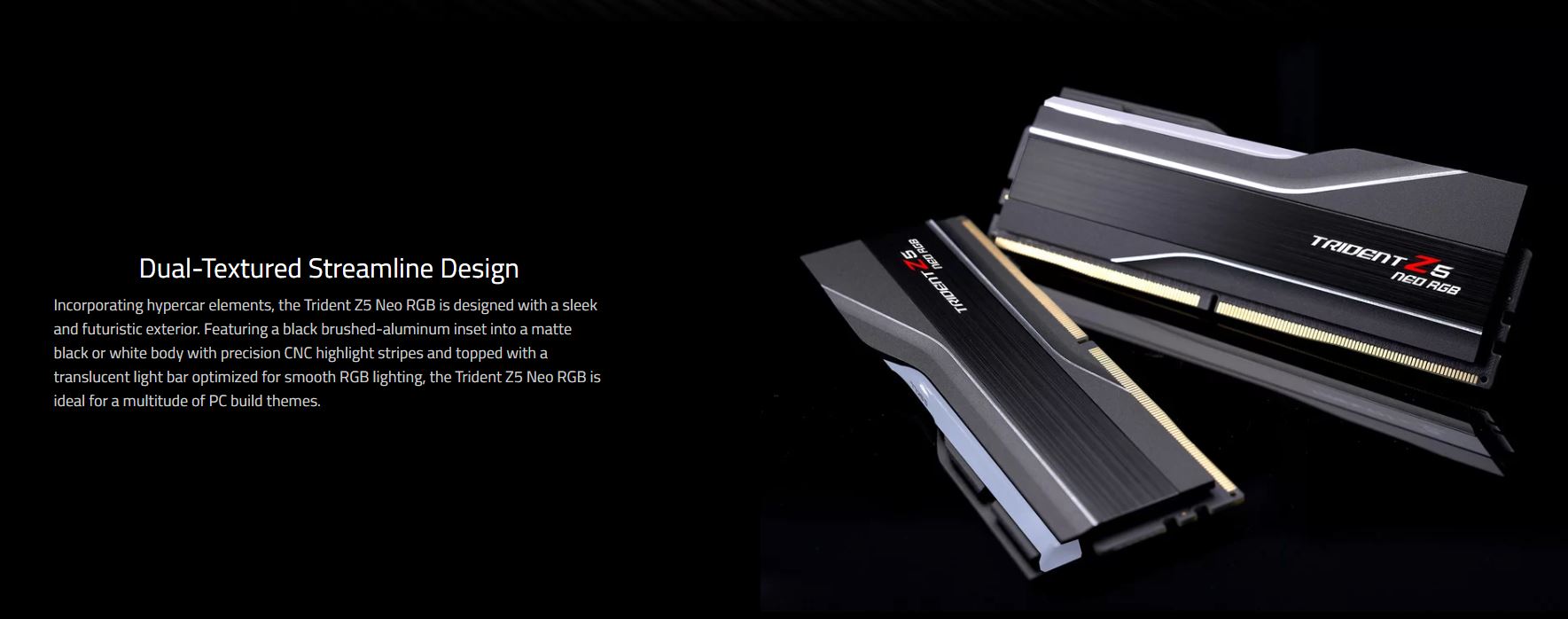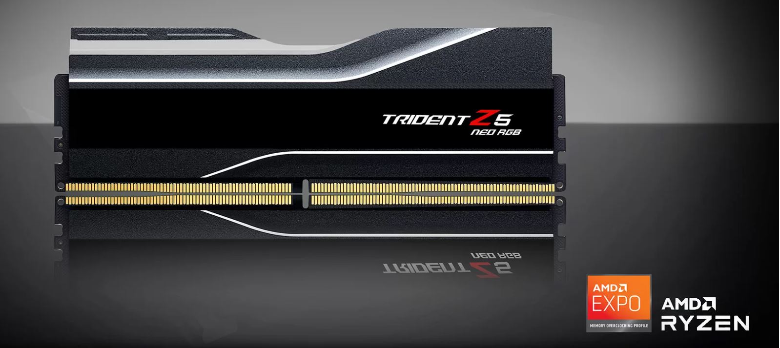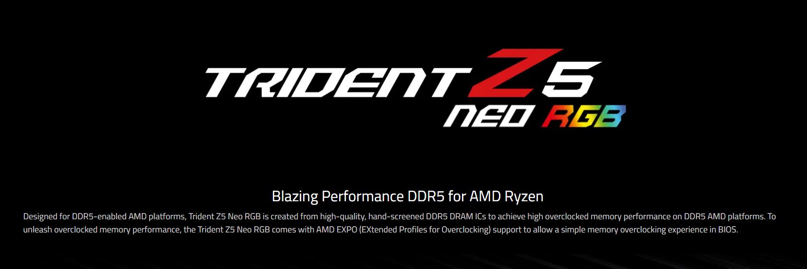 > Trident Z5 Neo RGB DDR5 memory is designed for ultra-high overclocked performance on DDR5-enabled AMD platforms. Featuring AMD EXPO overclocking technology for easy memory overclocking on supported AMD platforms, the Trident Z5 Neo RGB series is the ideal choice for building high-performance systems.