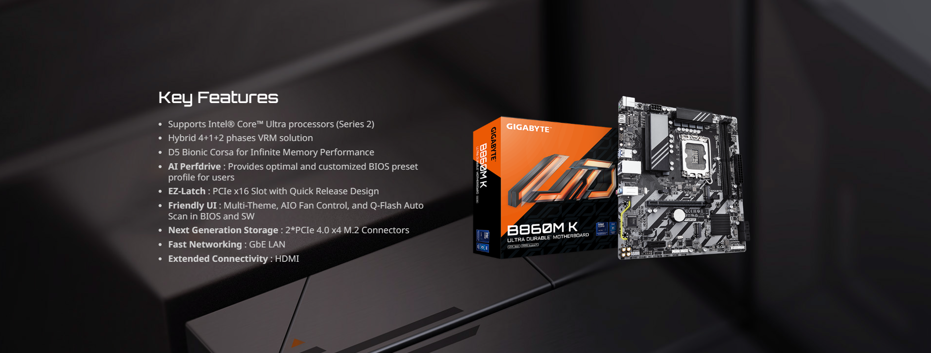 Build your dream PC with the Gigabyte B860M K Micro-ATX Motherboard 🖥️—crafted for gamers, creators, and performance enthusiasts. Designed for Intel® Core™ Ultra (Series 2) processors on the LGA1851 socket, this board combines blazing-fast DDR5 memory, PCIe 4.0 storage, and GIGABYTE Ultra Durable™ engineering for unbeatable stability and long-term reliability.