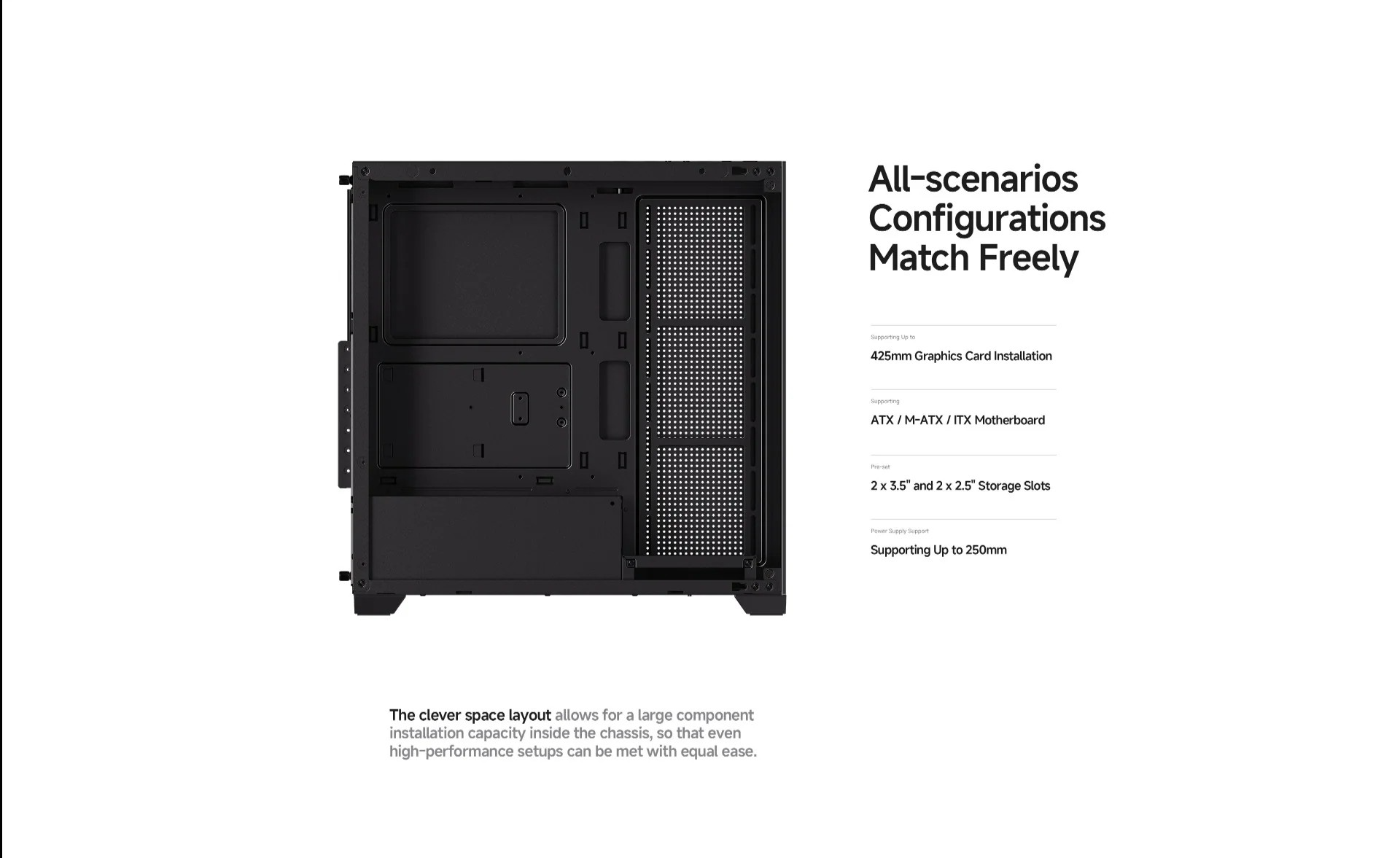 Top panel supports radiators up to 360mm in length, up to 425mm GPU and 250mm PSU clearance.
