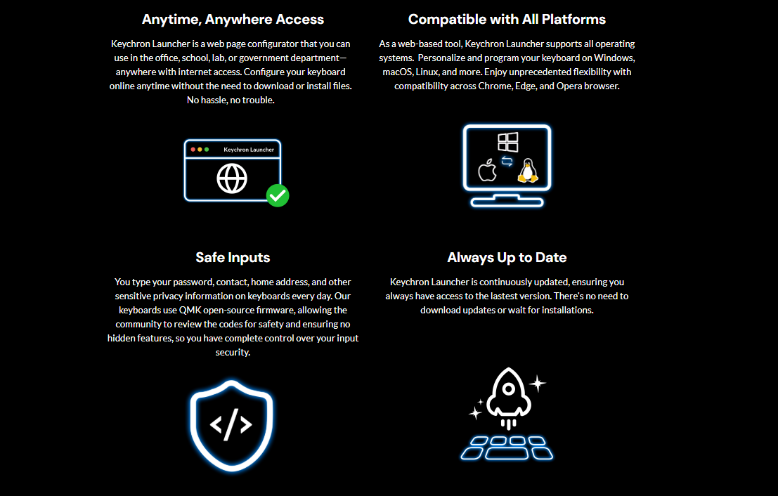 Keychron Launcher runs in your browser—Chrome, Edge, Opera—on any OS including Windows, macOS, and Linux. Whether you're in the office, lab, or classroom, you can tweak your keyboard settings on the fly.