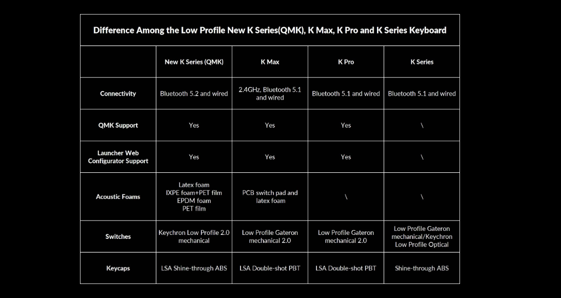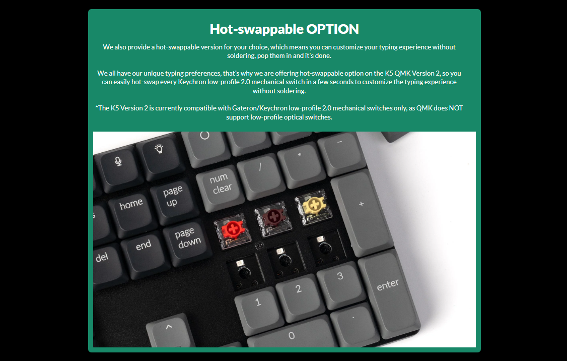 Customize your typing experience in seconds—no soldering required. Supports Keychron/Gateron Low-Profile 2.0 mechanical switches. Note: QMK does not support low-profile optical switches.