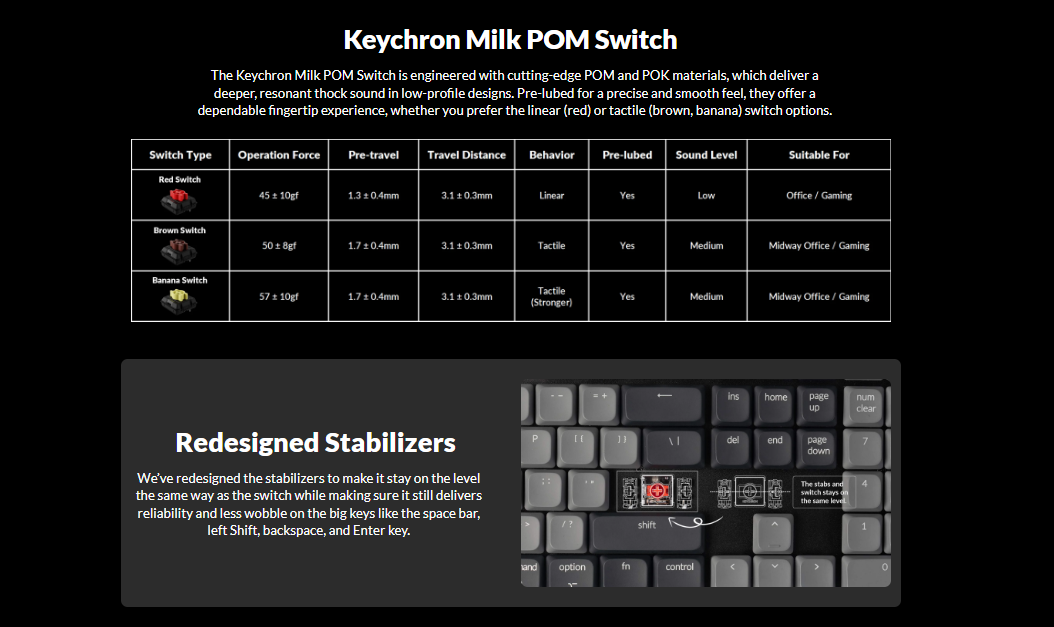 Improved stabilizers minimize wobble on larger keys like Spacebar, Shift, Backspace, and Enter—ensuring consistent keystrokes and long-term reliability.