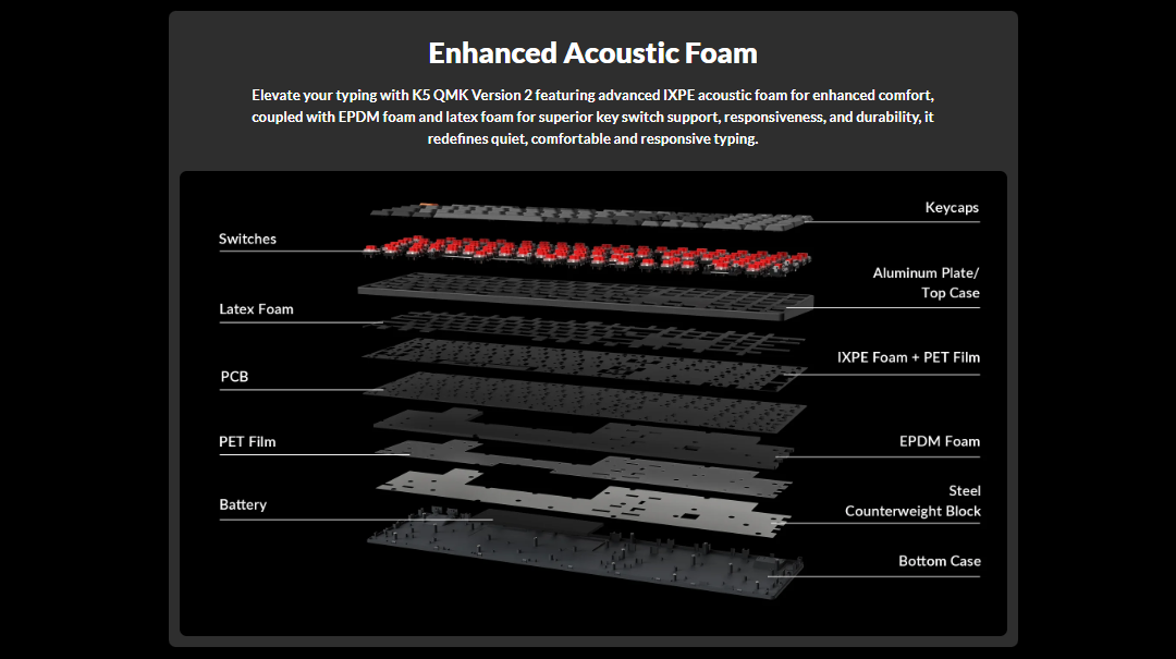 Enjoy a quieter, more refined typing experience with layers of IXPE, EPDM, and latex foam. These materials absorb sound and improve switch responsiveness for a smoother, more comfortable feel.