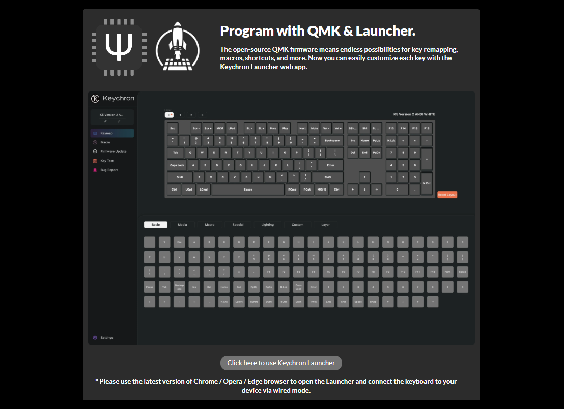 Powered by open-source QMK firmware, the K5 V2 unlocks advanced key remapping, macros, and shortcuts. Customize every key using the Keychron Launcher web app—no downloads, no fuss.