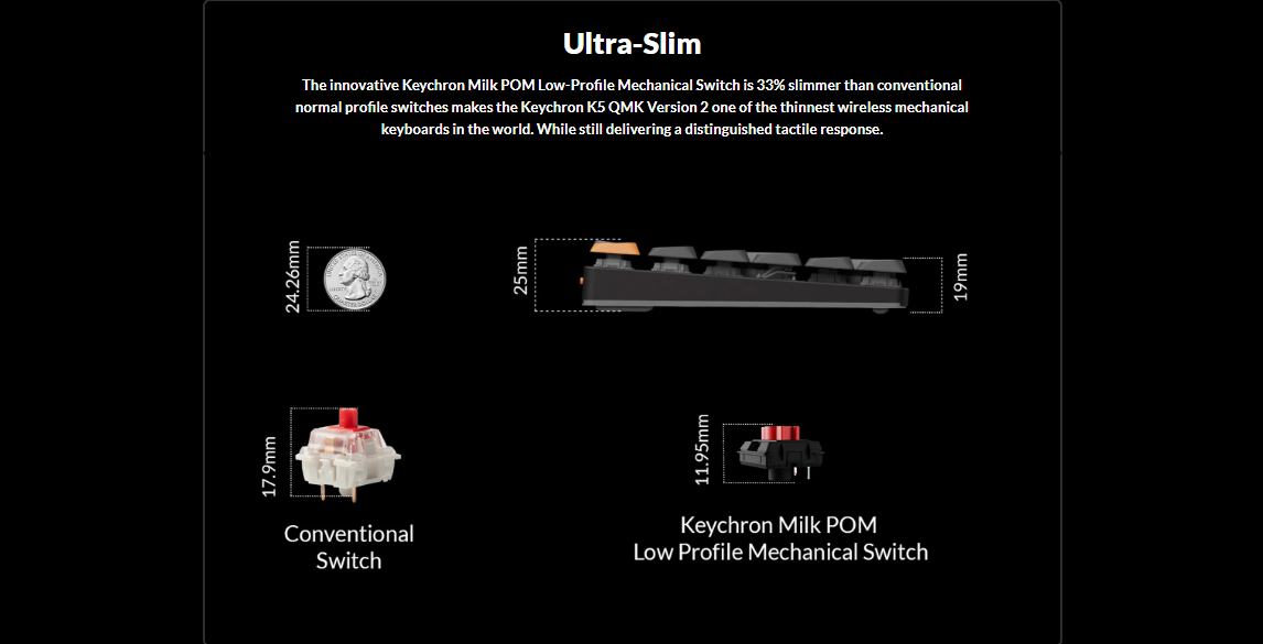 Featuring Keychron’s Low-Profile 2.0 Mechanical Switches, which are 33% slimmer than standard switches, the K5 V2 is one of the thinnest full-size mechanical keyboards in the world—without sacrificing tactile feedback.