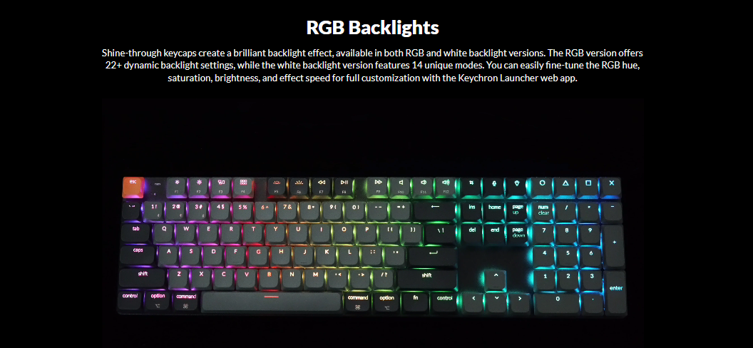 Shine-through keycaps paired with 22+ RGB effects or 14 white backlight modes. Customize hue, brightness, and speed directly through the Keychron Launcher.