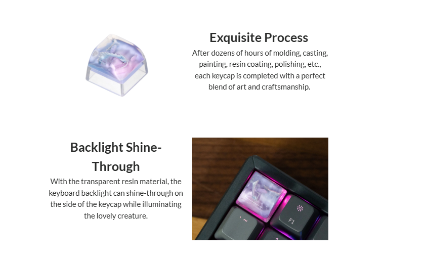 These amazing artisan keycaps bring mysterious, colorful creatures directly to your keyboard. Each keycap is molded in multi-layered, and sculpted in SA profile. The keycaps are compatible with most MX-style switches on the market.