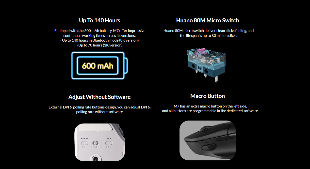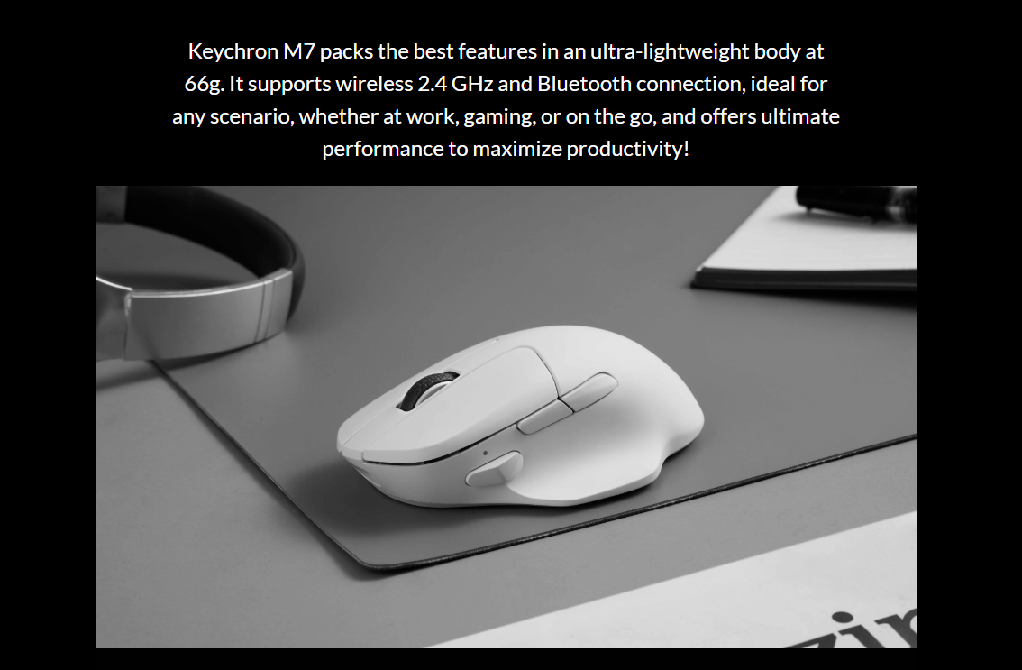 *Keychron M7 packs the best features in an ultra-lightweight body at 63g. It supports wireless 2.4 GHz and Bluetooth 5.1 connection, ideal for any scenario, whether at work, gaming, or on the go, and offers ultimate performance to maximize productivity!