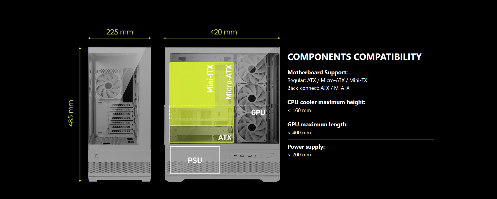 🏗️ Form Factor: Mid-Tower with support for ATX / Micro-ATX / Mini-ITX (Regular) & ATX / Micro-ATX (Back-connect)