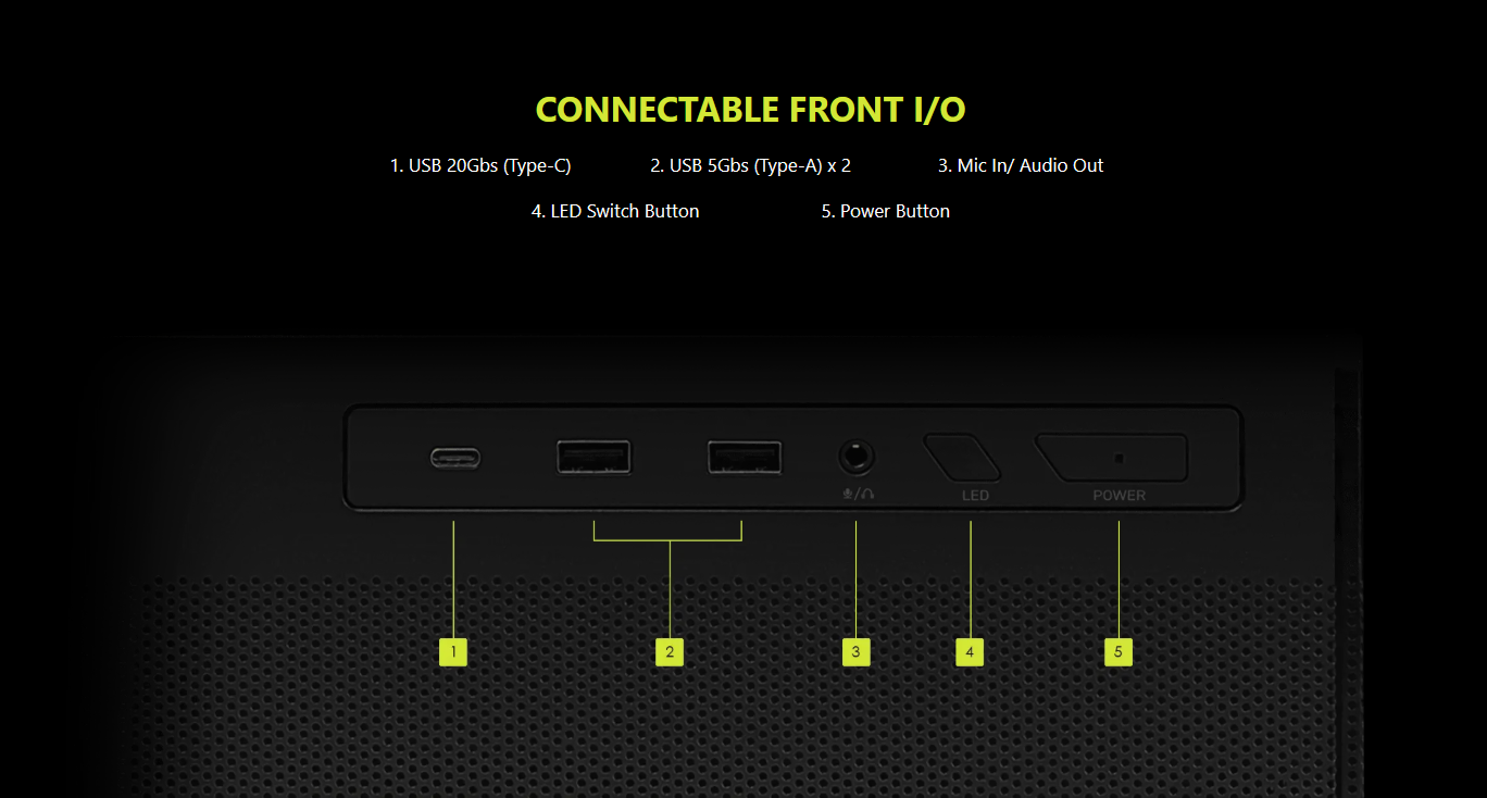 🔌 Front I/O Ports: 1x USB 20Gbps (Type-C), 2x USB 5Gbps (Type-A), Audio-out/Mic-in, LED button, Power button