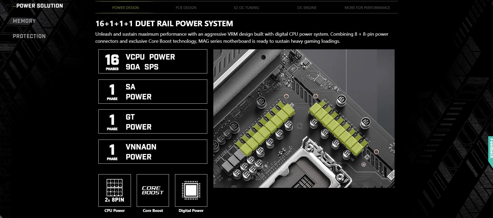 > Ultra Performance: 16+1+1+1 Duet Rail Power System 90A SPS, dual 8-pin CPU power connectors, Core Boost, Memory Boost, 6-layer PCB made by 2oz thickened copper and server-grade level material