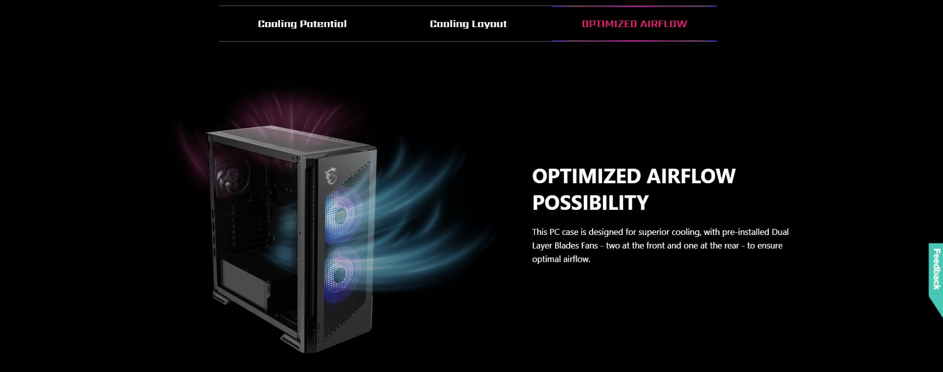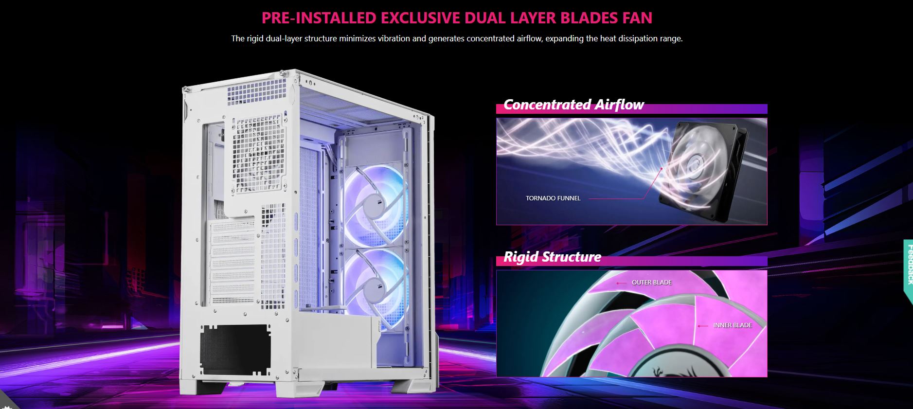 > Pre-installed with 2 x 160 mm ARGB Dual Layer Blades Fan at the front and 1 x 120 mm Dual Layer Blades Fan at the rear.