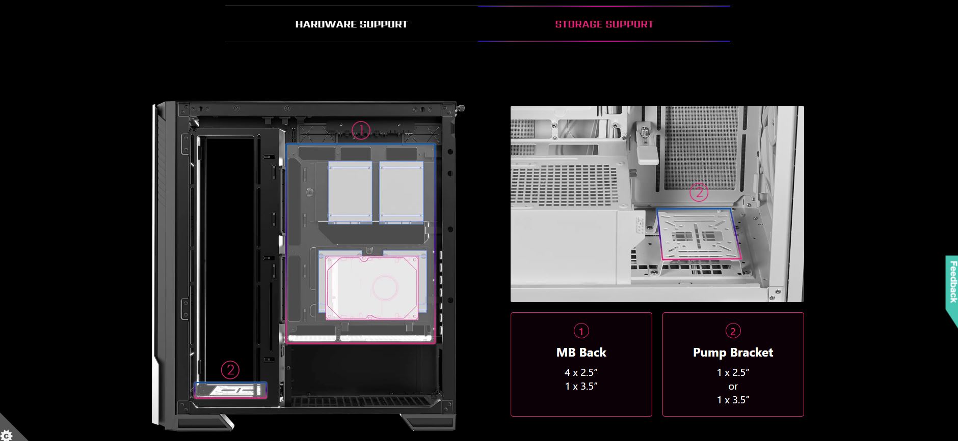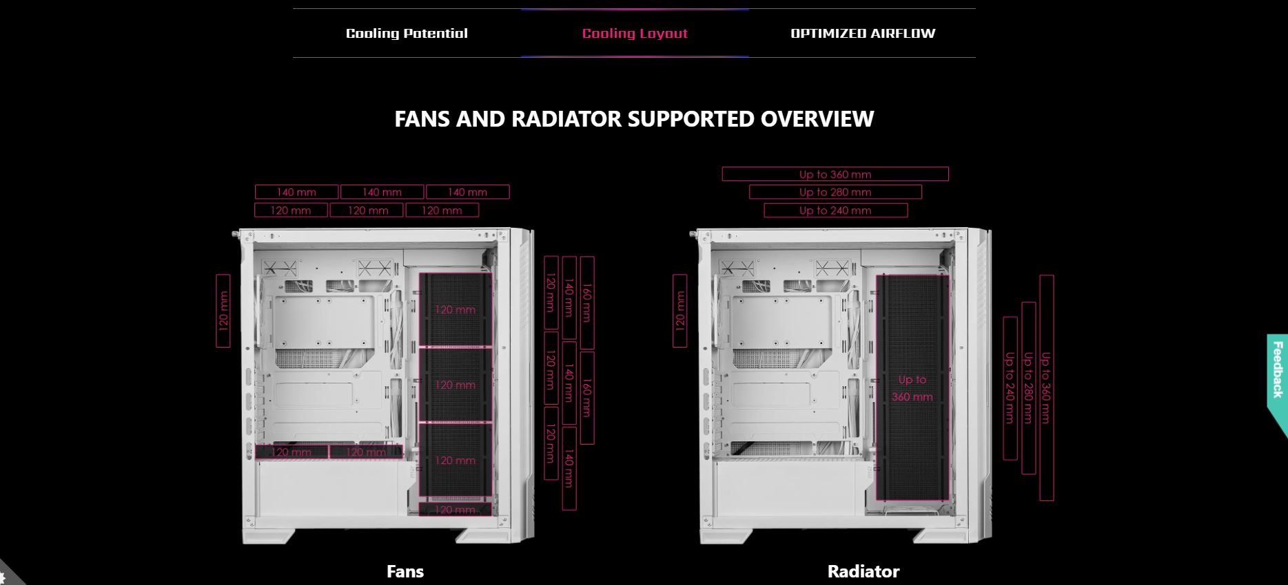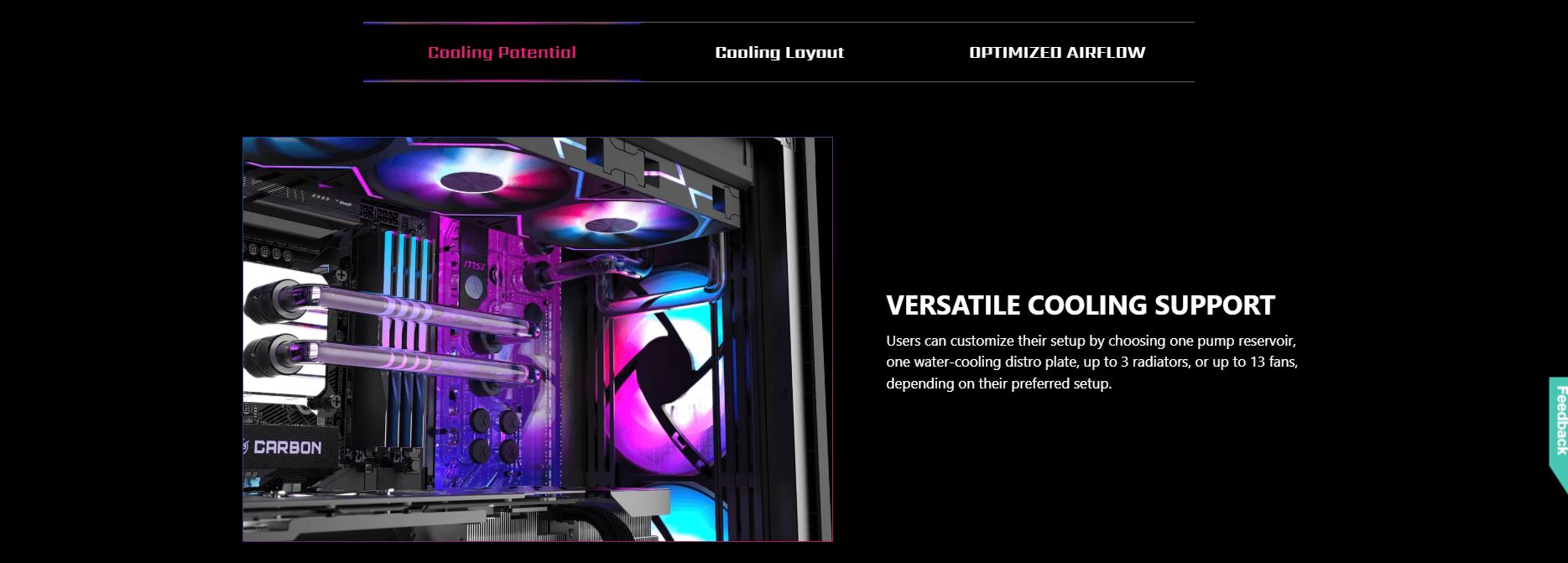 > Support three setting spaces for 360 mm radiators (Can be equipped with two 360 mm radiators simultaneously), up to thirteen fans, one Pump Reservoir, or one water cooling distro plate.