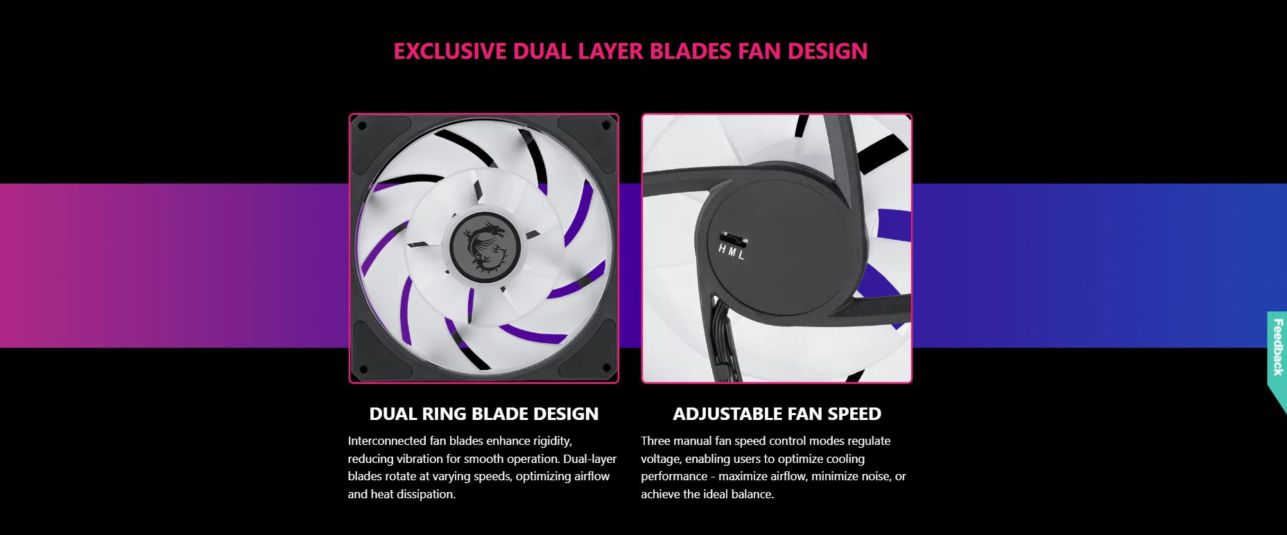 > The Dual Layer Blades Fan consists of outer and inner ring blades that rotate simultaneously, creating concentrated airflow and enhanced heat dissipation.