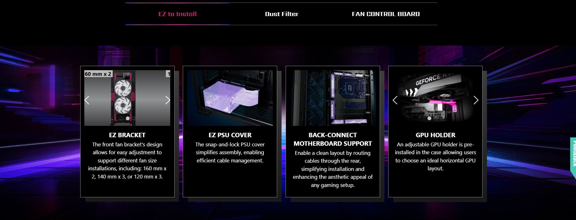 > Quick snap-and-lock PSU cover for easy assembly and streamlined cable management, optimizing the building process.