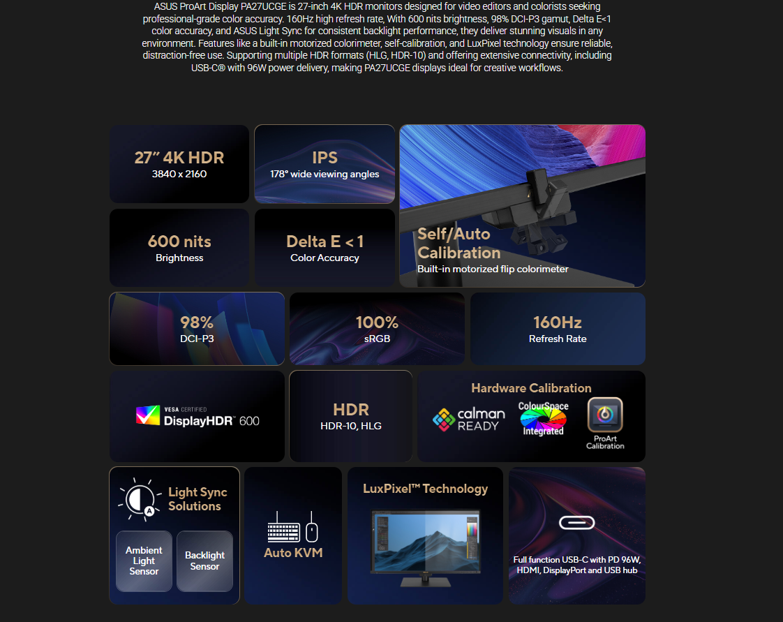 *ASUS ProArt Display PA27UCGE Professional Monitor – 27-inch, 4K (3840 x 2160), IPS, 600 nits, 98% DCI-P3, Delta E<1 color accuracy, 160Hz, Built-in Motorized Colorimeter, Self / Auto Calibration, Hardware Calibration, HDR-10, HLG, Auto KVM, LuxPixel™ AGLR, Light Sync, USB-C® PD 96W, ergonomic stand, Calman Ready, ColourSpace Integration, eco-friendly and sustainable design
