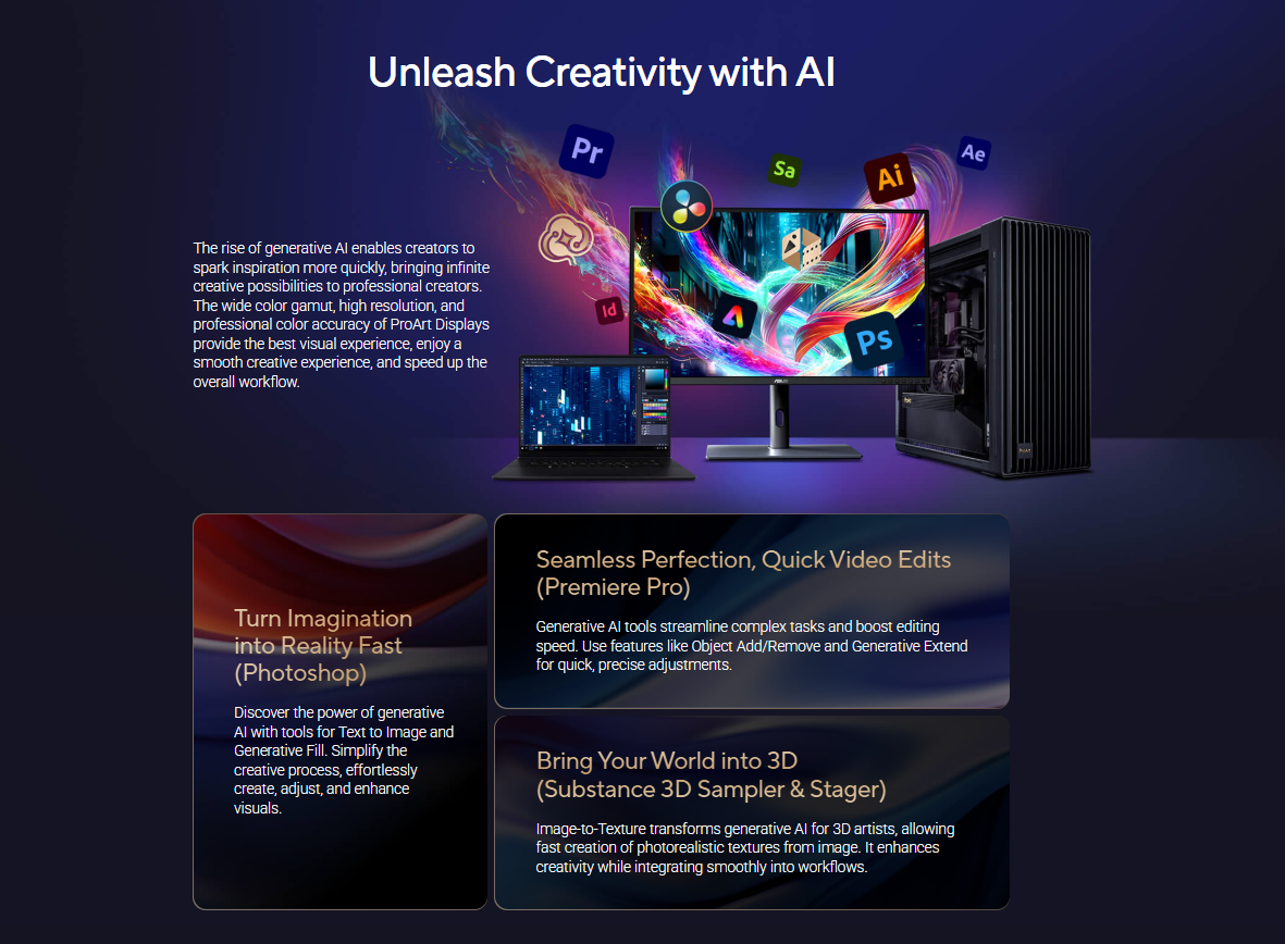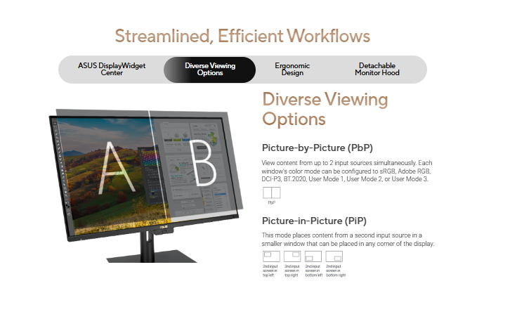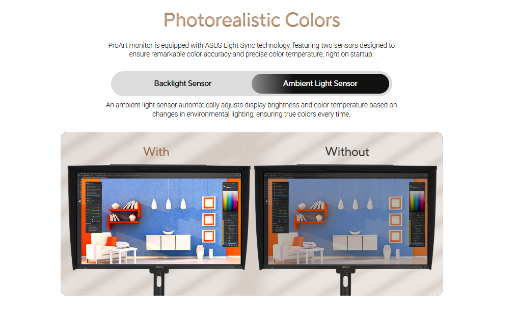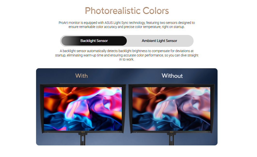 - ASUS Light Sync solution with Ambient Light Sensor and Backlight Sensor to ensure reliable color performance