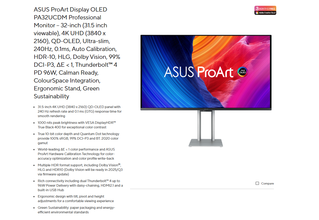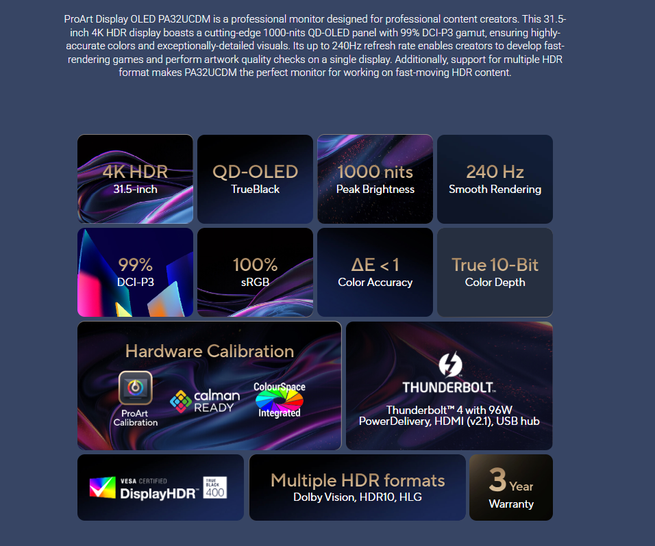 *ASUS ProArt Display OLED PA32UCDM Professional Monitor – 32-inch (31.5 inch viewable), 4K UHD (3840 x 2160), QD-OLED, Ultra-slim, 240Hz, 0.1ms, Auto Calibration, HDR-10, HLG, Dolby Vision, 99% DCI-P3, ΔE < 1, Thunderbolt™ 4 PD 96W, Calman Ready, ColourSpace Integration, Ergonomic Stand, Green Sustainability