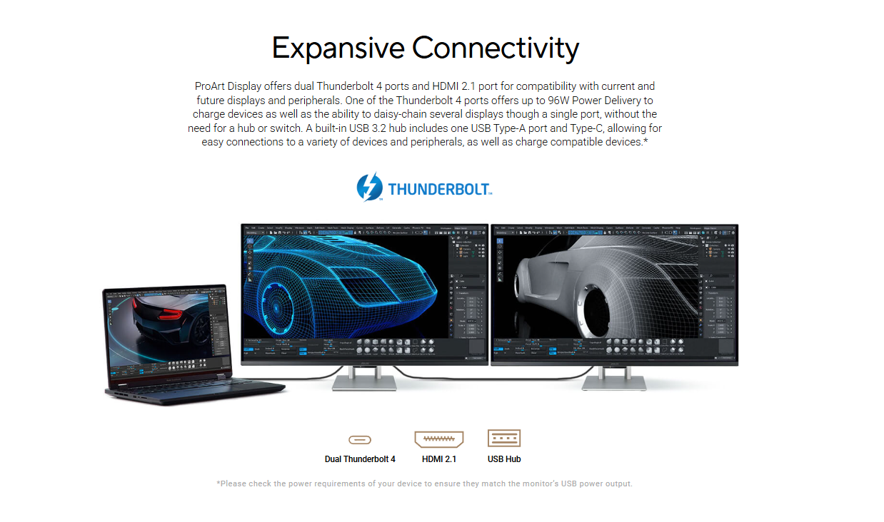 - Rich connectivity including dual Thunderbolt™ 4 up to 96W Power Delivery with daisy-chaining, HDMI2.1 and a built-in USB Hub