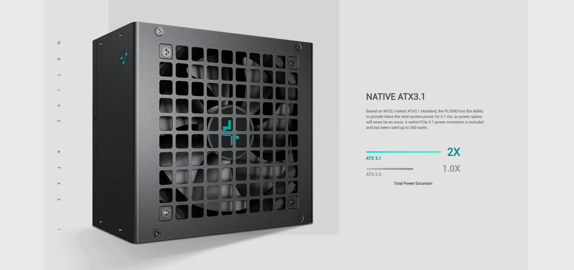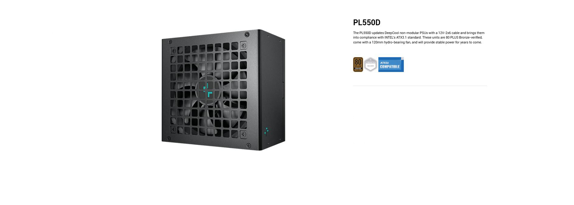 > The PL550D updates DeepCool non-modular PSUs with a 12V-2x6 cable and brings them into compliance with INTEL's ATX3.1 standard. These units are 80 PLUS Bronze-verified, come with a 120mm hydro-bearing fan, and will provide stable power for years to come.