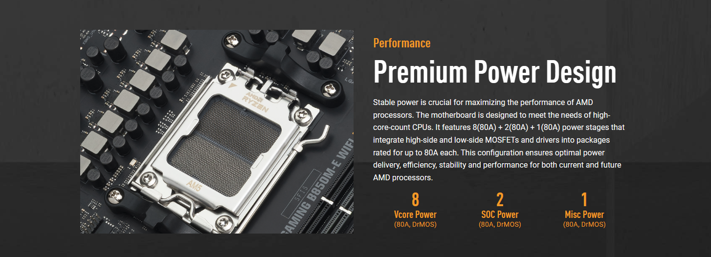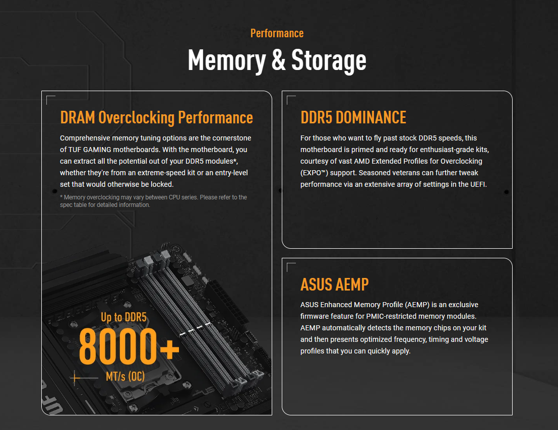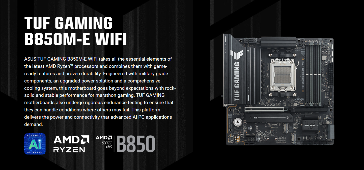 The ASUS TUF GAMING B850M-E WIFI is built for gamers and creators seeking stability, speed, and next-gen support. Designed with military-grade components and robust thermal solutions, it supports the latest AMD Ryzen™ 9000/8000/7000 processors, blazing-fast DDR5 memory, and PCIe 5.0, making it ideal for AI-powered and high-performance PC builds.