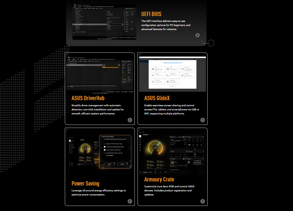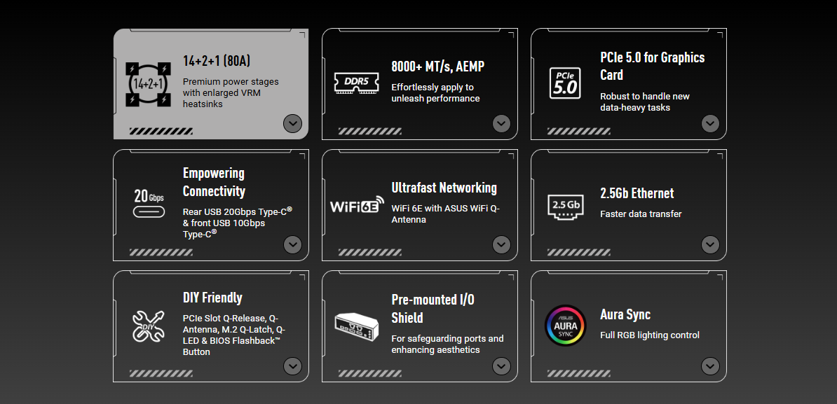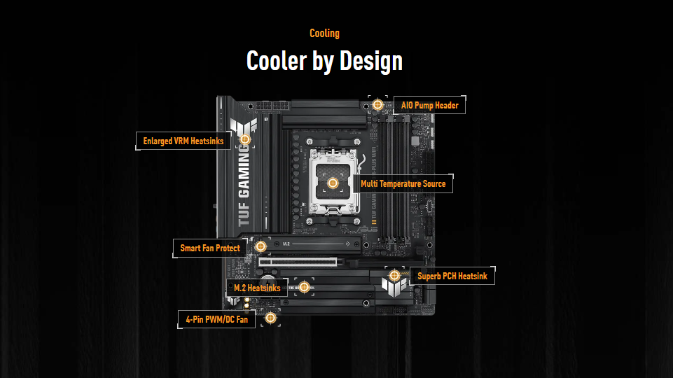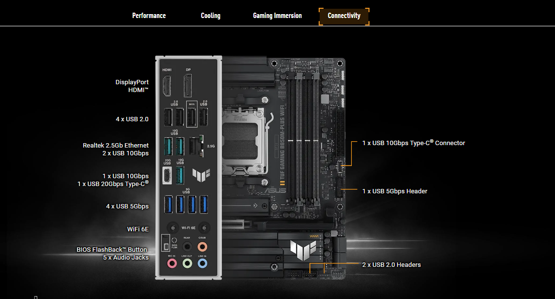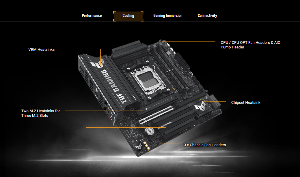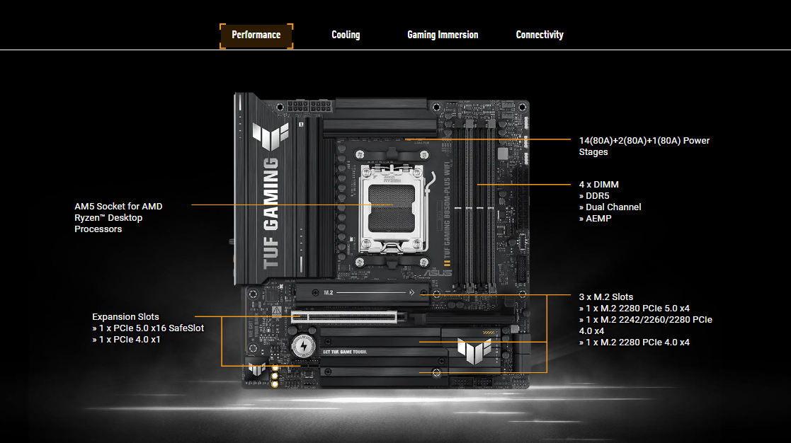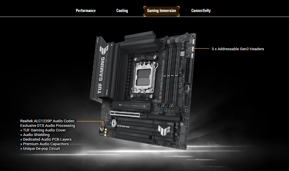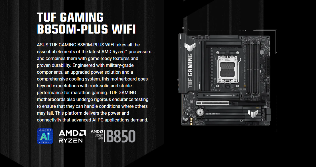 ASUS TUF GAMING B850M-PLUS WIFI takes all the essential elements of the latest AMD Ryzen™ processors and combines them with game-ready features and proven durability. Engineered with military-grade components, an upgraded power solution and a comprehensive cooling system, this motherboard goes beyond expectations with rock-solid and stable performance for marathon gaming. TUF GAMING motherboards also undergo rigorous endurance testing to ensure that they can handle conditions where others may fail. This platform delivers the power and connectivity that advanced AI PC applications demand.