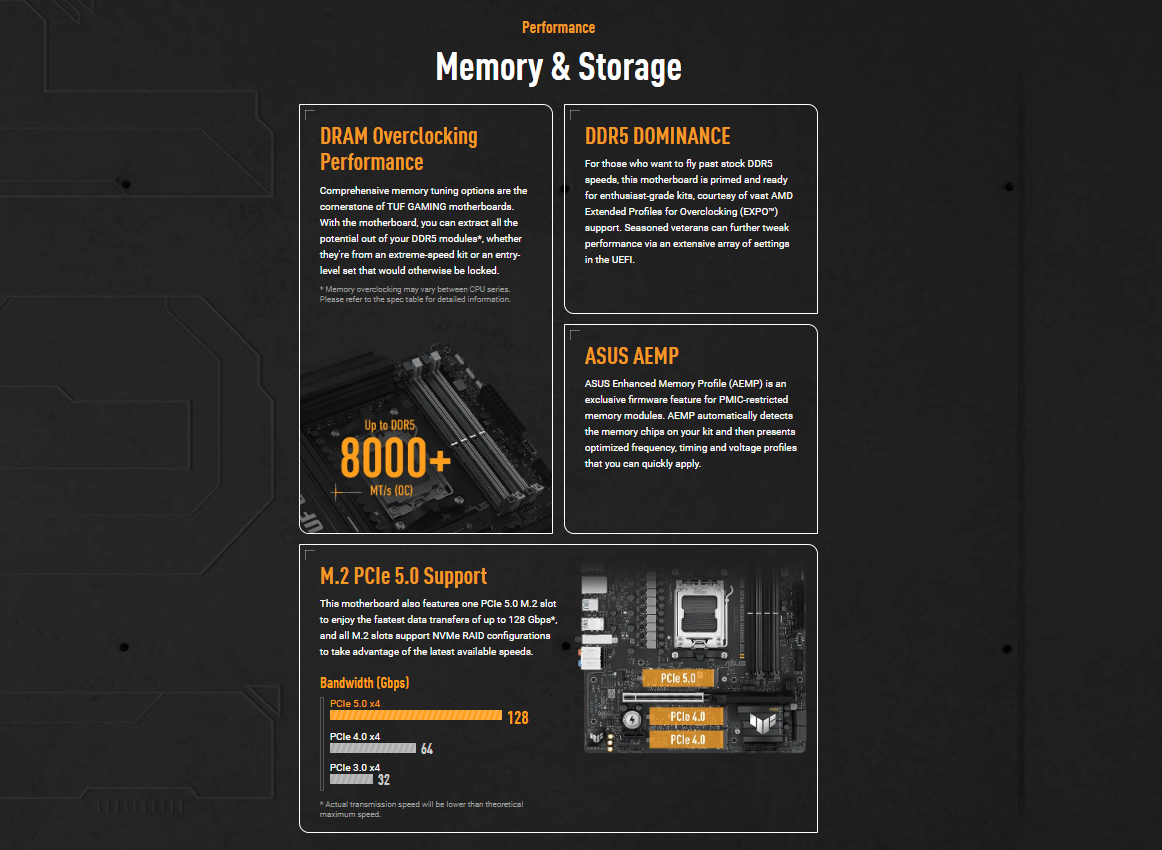 Supports up to 8000+MT/s (OC) with Ryzen™ 9000 & 8000 & 7000 Series Processors, ECC and Non-ECC Un-buffered DIMM*