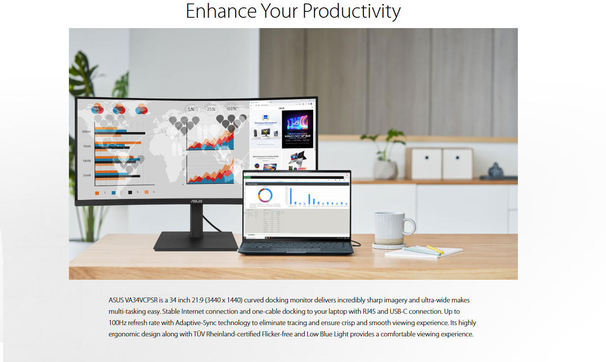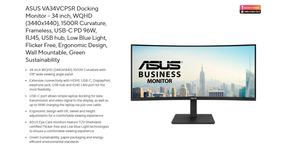 Product Name: Itw | ASUS Curved Docking Monitor VA34VCPSR 34" 3440x1440 WQHD / 100Hz / VA / 4ms GTG /Flicker Free