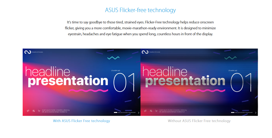 - ASUS Eye Care monitors feature TÜV Rheinland-certified Flicker-free and Low Blue Light technologies to ensure a comfortable viewing experience