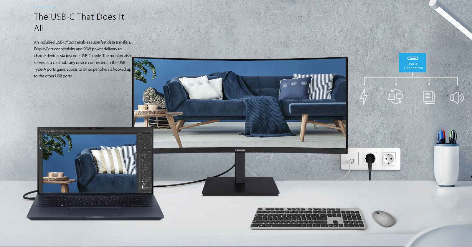 - USB-C port allows simple laptop docking for data transmission and video signal to the display, as well as up to 96W charging the laptop via just one cable
