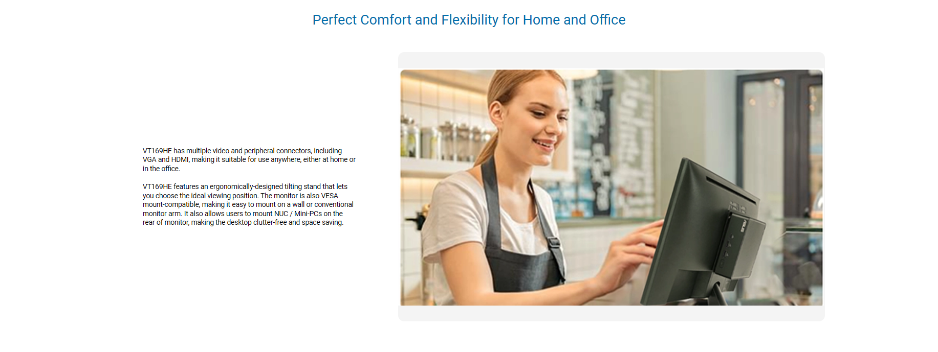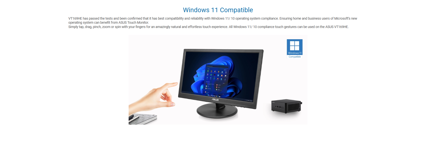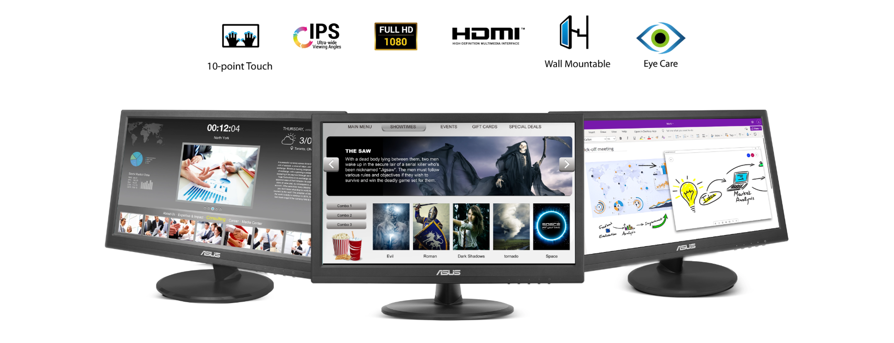 The ASUS VT169HE is a sleek and versatile 15.6” Full HD touch monitor designed for productivity, creativity, and interactive applications. Its 10-point multi-touch capability and IPS wide-viewing panel make it perfect for use as a secondary display, POS machine, or interactive kiosk.