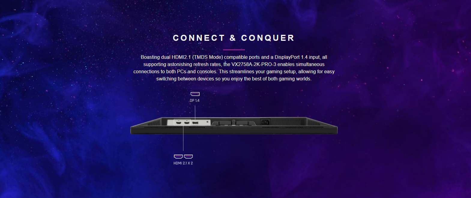 🔌 Flexible Connectivity – Dual HDMI 2.1 + DisplayPort 1.4 for PC, console, and more.